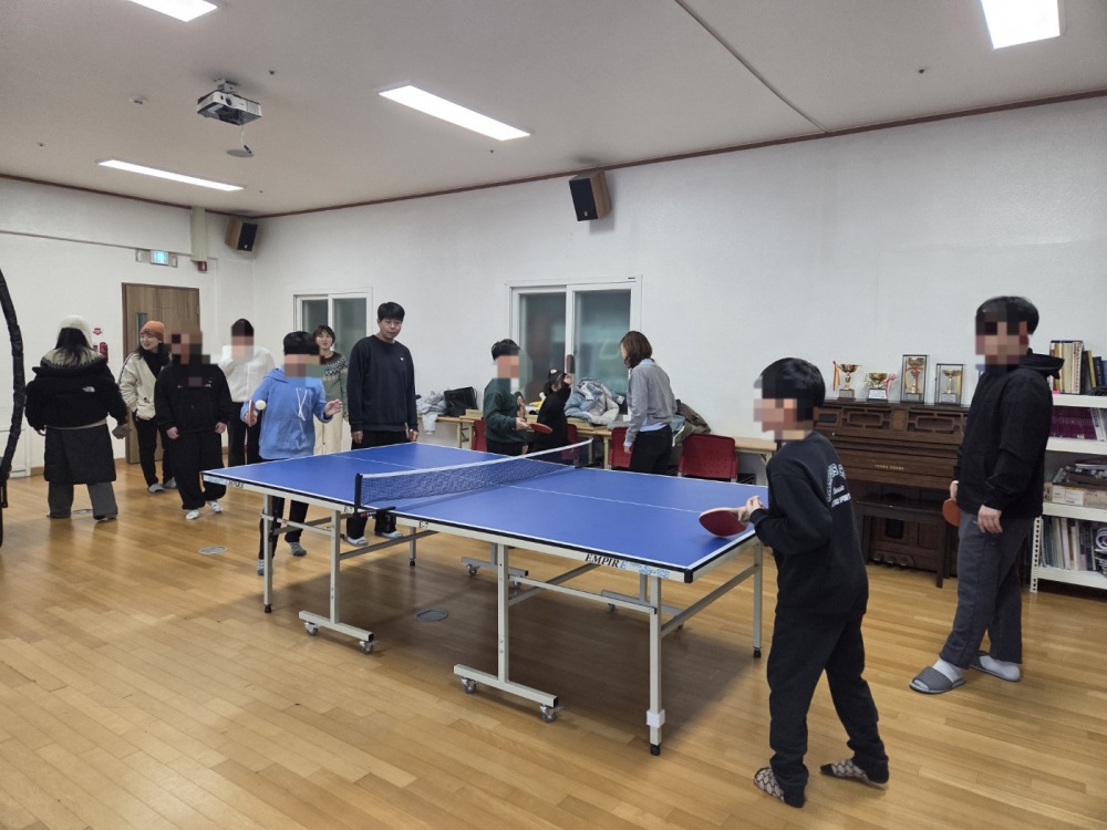 정성 가득한 떡국와 다양한 반찬으로 따뜻하고 맛있는 점심 시간이 되었고 체육활동으로 탁구 치기를 하며 아이들이